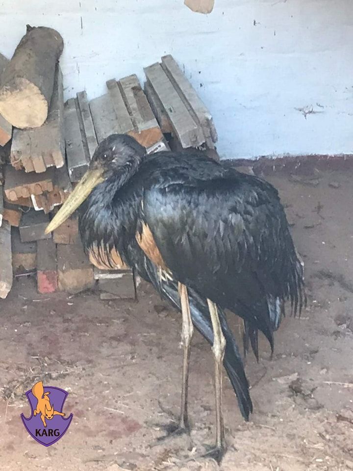 Очевидці розповіли, що лелека спокійно зайшов у двір, але насправді шукав допомоги. Господарі двору побачили, що він повністю облитий чимось на кшталт олії чи смоли.