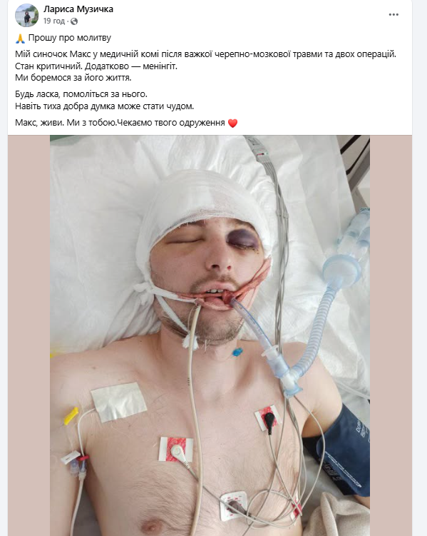 Пізніше мати хлопця уточнила, що він у медичній комі після черепно-мозкової травми та двох операцій. «Мій синочок Макс у медичній комі після важкої черепно-мозкової травми та двох операцій. Стан критичний. Додатково — менінгіт», — зазначила жінка.