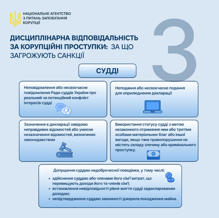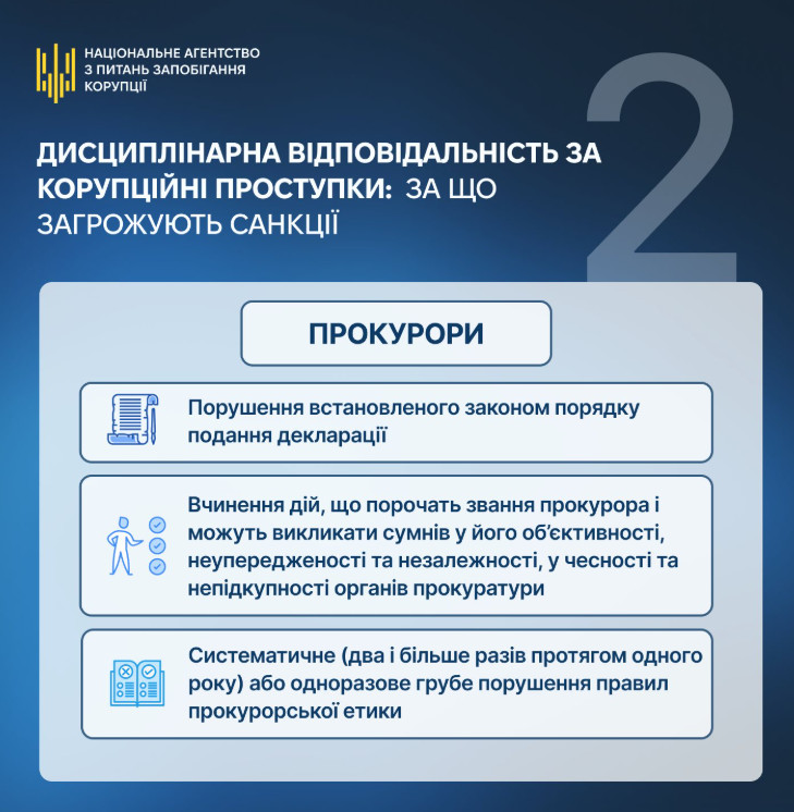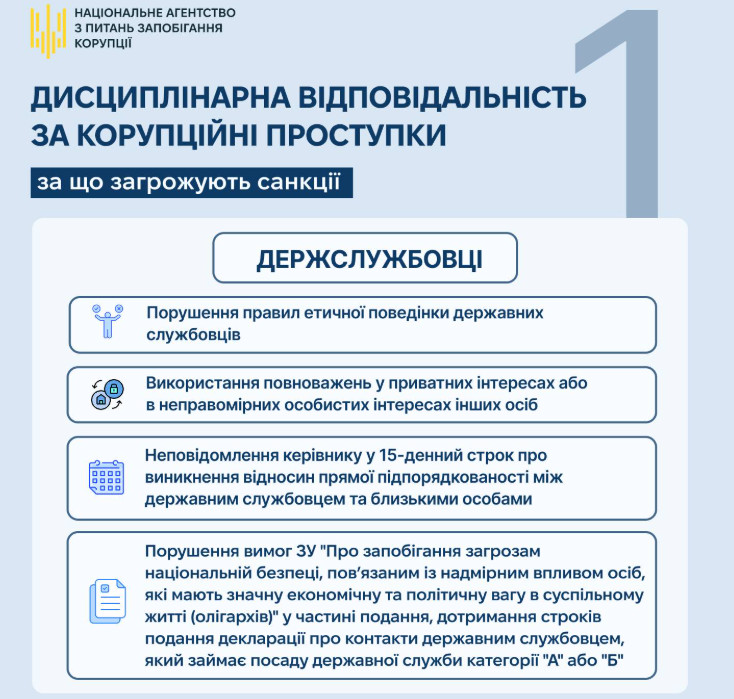 Національне агентство з питань запобігання корупції нагадало, що одним із видів юридичної відповідальності за вчинення корупційних або пов’язаних з корупцією правопорушень є дисциплінарна. Вона застосовується як самостійно, так і паралельно з іншими видами відповідальності (кримінальною, адміністративною чи цивільно-правовою).