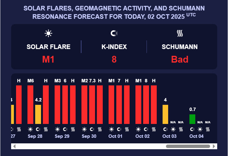 Ще 1 жовтня геомагнітний шторм досягав 7 балів, і прогнозувалося його послаблення до 4 балів, але ситуація змінилася. Британська геологічна служба попереджає, що найближчими днями буря може посилитися, з піковими активними періодами, після чого піде на спад. За даними meteoprog, за останні 24 години зафіксовано 6 спалахів класів С і М на Сонці, де зараз налічується 67 сонячних плям. Ймовірність нових спалахів класу М 2 жовтня становить 65%, а класу Х — 15%. Магнітна буря може спричинити перепади тиску, мігрені, нудоту та збої в засобах зв’язку.