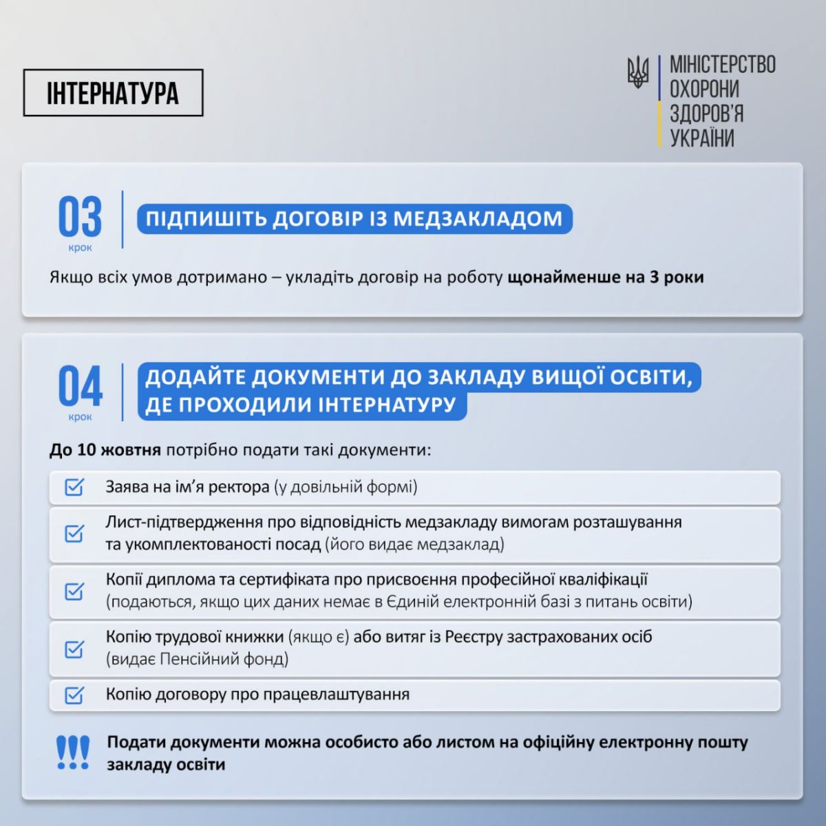 Щоби отримати таку виплату, лікар має працевлаштуватися щонайменше на три роки у сільській місцевості та на прифронтових територіях і до 10 жовтня подати до закладу вищої освіти, де він або вона проходила інтернатуру, документи.
