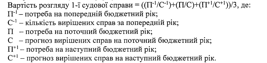 Вартість розгляду 1-ї судової справи = ((потреба на попередній бюджетний рік / кількість вирішених справ за попередній рік) + (потреба на поточний бюджетний рік / прогноз вирішених справ на поточний бюджетний рік) + (потреба на наступний бюджетний рік / прогноз вирішених справ на наступний бюджетний рік)) / 3.