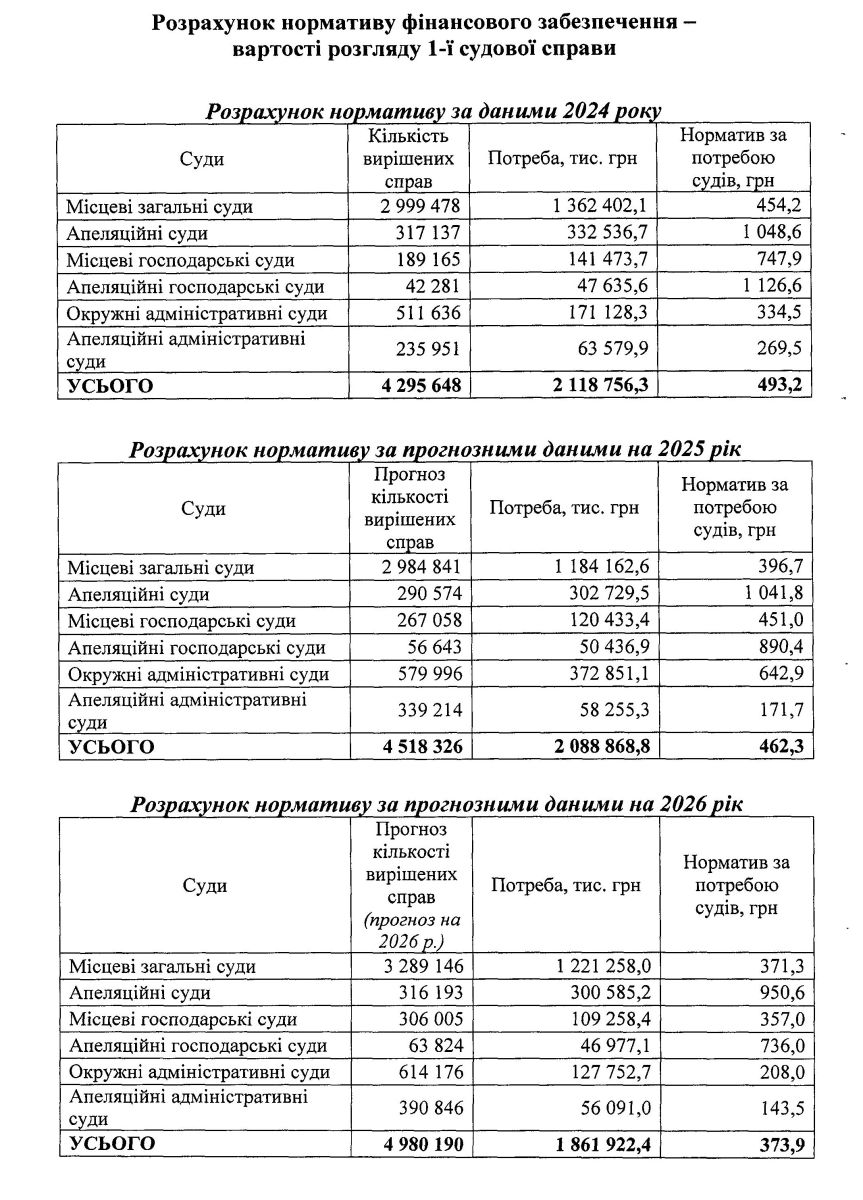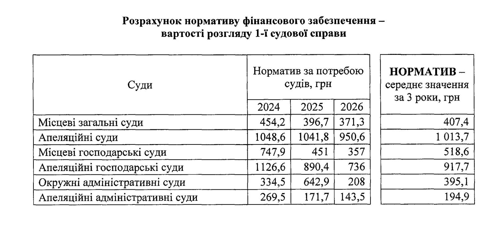 Згідно з рішенням ВРП, середня вартість розгляду однієї судової справи (без видатків на оплату праці та нарахувань на заробітну плату, оплату комунальних послуг та енергоносіїв) становить:
