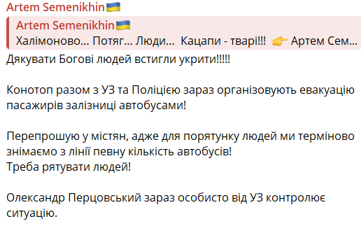 Згодом Артем Семеніхін додав, що люди не постраждали. За його словами, наразі організована евакуація пасажирів залізниці автобусами.