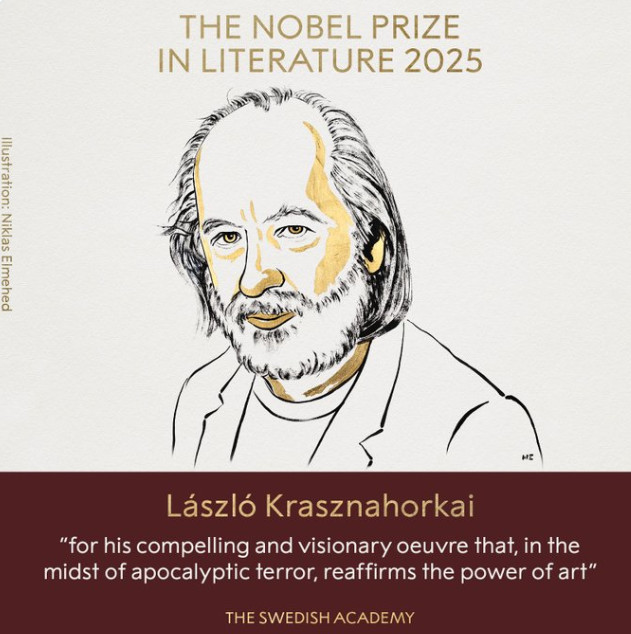Лауреатом Нобелівської премії з літератури 2025 року став угорський письменник Ласло Краснагоркаї «за його переконливу та пророчу творчість, яка серед апокаліптичного терору підтверджує силу мистецтва». Про це повідомили на сторінці премії у соцмережі Х.