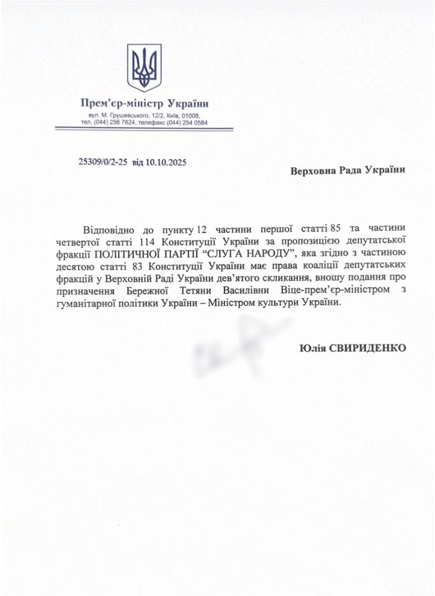 Голова Верховної Ради України Руслан Стефанчук повідомив, що прем’єр-міністр Юлія Свириденко подала пропозицію призначити Тетяну Бережну Віце-прем’єр-міністром з гуманітарної політики — Міністром культури України.
