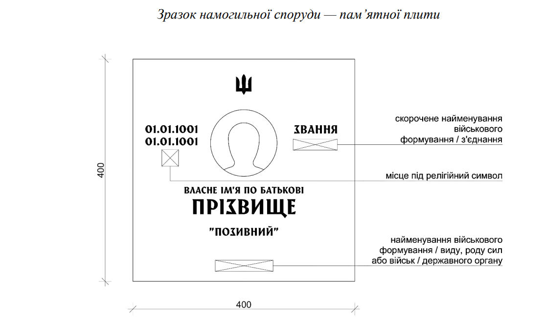 За бажанням родини чи уповноваженої особи, на плиті можуть бути зображені елементи релігійної символіки, позивний, скорочене найменування або емблема військового формування, виду чи роду військ, або державного органу.