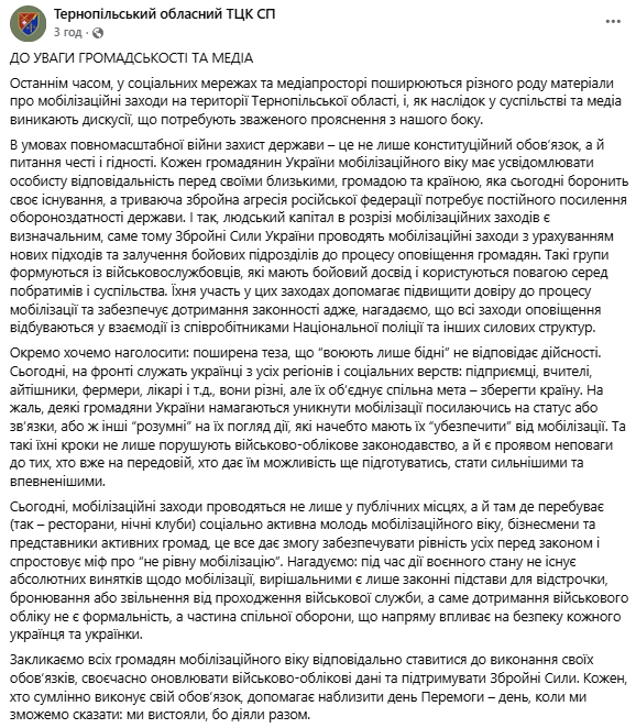Також Тернопільський ТЦК заявляє, що почав залучати «бойові підрозділи» до мобілізації громадян.