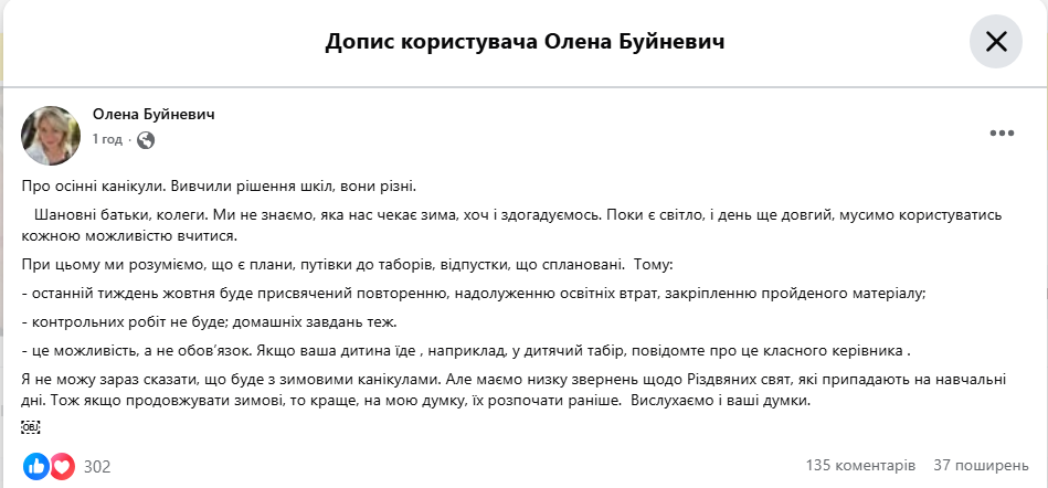 Щодо зимових канікул, рішення поки не ухвалено. Однак, за словами Буйневич, враховуючи запити і співпадіння з Різдвяними святами, їх можуть розпочати раніше, ніж зазвичай.