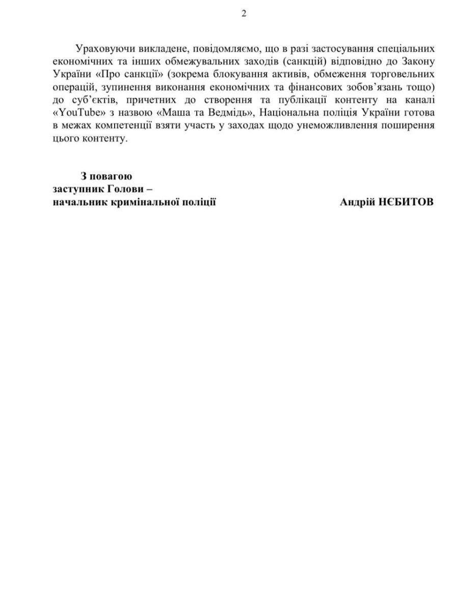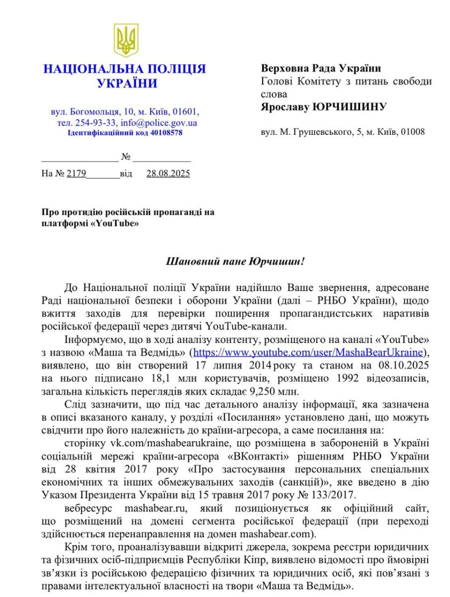 "Нацполіція підтвердила, що мультфільм має зв’язки з країною-агресором і підтримує ідею накладення санкцій. Я звернувся до поліції щодо ймовірної причетності "Маші і Ведмедя" до РФ, і у відповіді отримав підтвердження цих зв’язків. У разі офіційних обмежень поліція готова долучитися до блокування контенту в Україні. Крім того, Кабінет міністрів направив відповідні листи до СБУ, Нацради з питань телебачення і радіомовлення, РНБО, МВС, МКСК та інших відомств", – розповів Юрчишин.