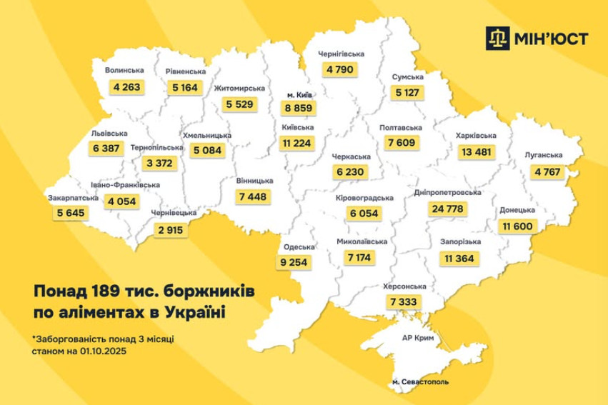 Зазначається, що станом на 1 жовтня 2025 року понад 189 тис. осіб мають заборгованість по аліментам за понад 3 місяці.