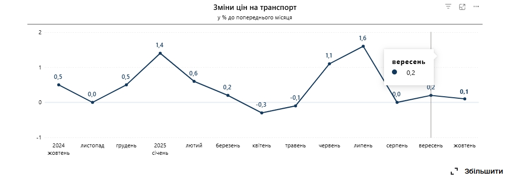 У порівнянні з жовтнем 2024 року, послуги зв'язку подорожчали на 16,4%, освітні послуги - на 14,6%, ресторанів і готелів - на 14,7%. Ціни послуг відпочинку та культури дещо знизилися - на 0,2%.