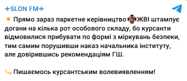 За даними спільноти SLON FM, керівництво інституту накладає догани на кілька рот курсантів, які виконали рекомендації Генштабу та не з’явилися на шикування у формі з міркувань безпеки.