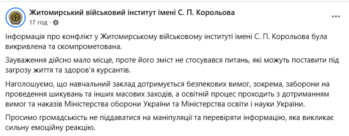 Військова служба правопорядку у ЗСУ розпочала перевірку в Житомирському військовому інституті імені С. П. Корольова після заяв курсантів про догани за відмову приходити на шикування у військовій формі.