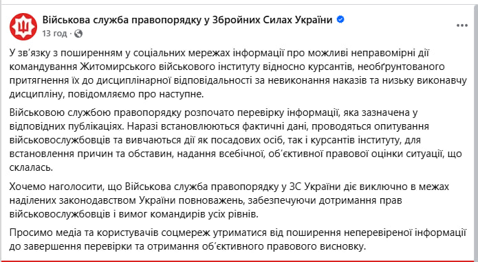 Військова служба правопорядку у Збройних Силах України повідомила, що проводить опитування військовослужбовців, вивчає дії як командування, так і курсантів, щоб встановити обставини та надати правову оцінку. До завершення перевірки просять утриматися від поширення неперевіреної інформації.
