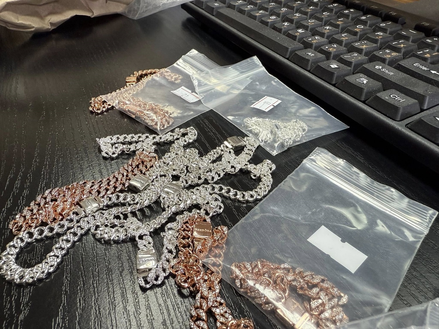 «Експерти підтвердили, що це контрафакт. Браслети виготовлені з латуні (сплав міді та цинку), їх срібне покриття - тоненький шар срібла, золоте - мідь, нікель, цинк і олово, а камінці - синтетичний фіаніт. В обох випадках Київська митниця склала протоколи про порушення митних правил за ст. 476 Митного кодексу України. Усі 102 браслети вилучено», – наголошується в повідомленні.