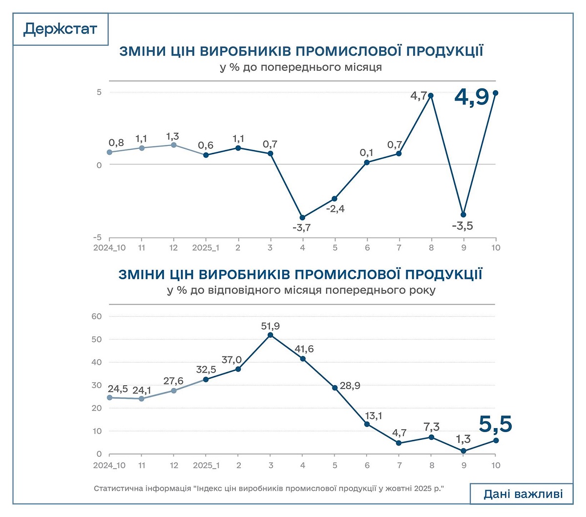 У жовтні 2025 року ціни виробників промислової продукції в Україні, після сповільнення у вересні, знову зросли на 5,5% у річному вимірі, повідомила Державна служба статистики.