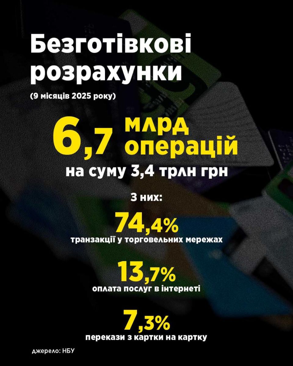 Загалом за три квартали кількість усіх транзакцій (готівкових і безготівкових) склала близько 7 млрд на суму 5,2 трлн грн. При цьому частка безготівкових розрахунків становила 3,4 трлн грн, що на 9,9% більше, ніж торік. Безготівкові операції переважали як за кількістю (95,4%), так і за сумою (65,4%).