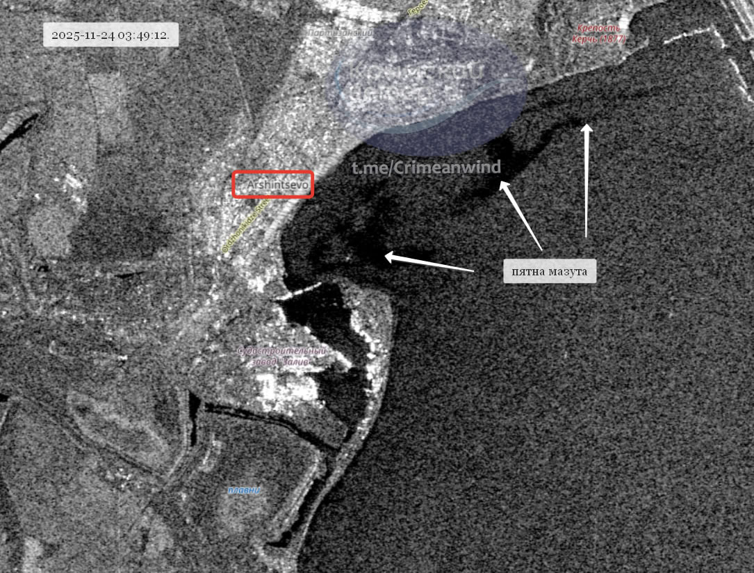 У Керченській протоці зафіксовано кілька великих мазутних плям. Про це повідомляє «Кримський вітер» з посиланням на супутникові знімки.