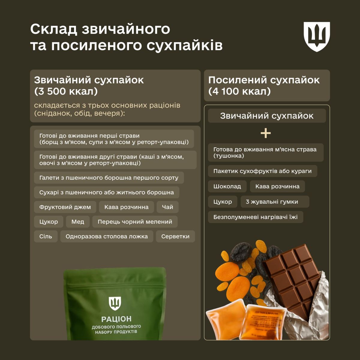 Енергетична цінність сухпайка складає 3 500 кілокалорій, що задовольняє потреби військових.
