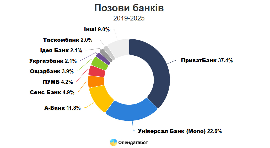 За даними відомства, загалом з 2019 року банки подали 511 865 позовів. Більшість цьогорічних звернень припадає на Універсал Банк/Mono (28 213 позовів), А-Банк (22 221) та Приватбанк (20 278). З великим відривом слідують ПУМБ (9 225) та Сенс Банк (6 831).