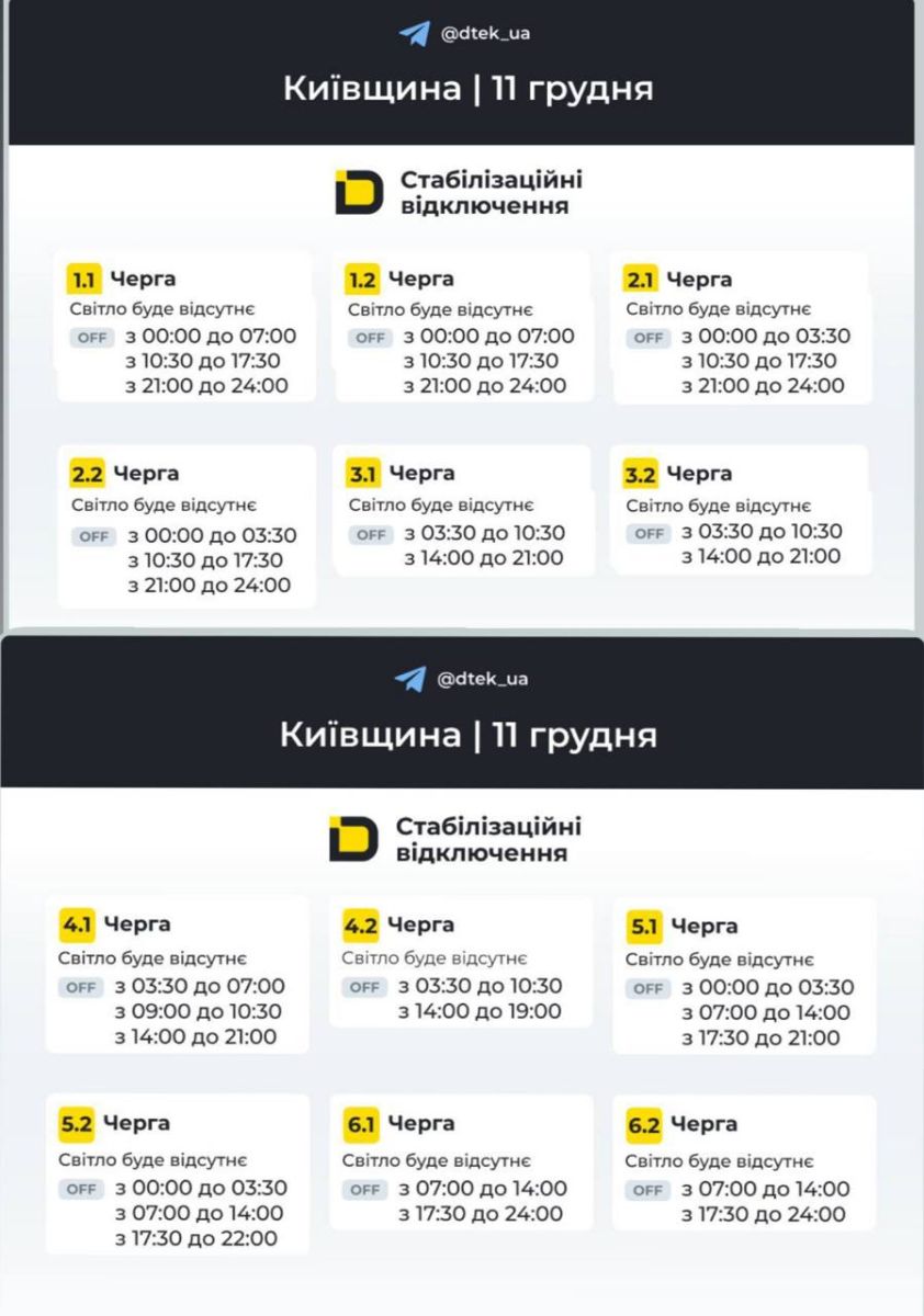 Стабілізаційні графіки, оприлюднені для Києва та Київської області на 11 грудня, демонструють значне навантаження на систему електропостачання: у більшості черг світло буде відсутнє від 12 до 17 годин на добу. У столиці тривалість вимкнень коливається переважно в межах 13–17 годин, тоді як на Київщині окремі черги мають відключення до 17 годин.