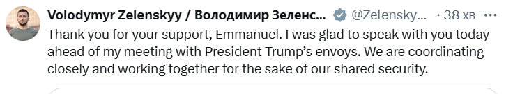 «Дякую за вашу підтримку, Еммануелю. Я був радий поговорити з вами сьогодні перед моєю зустріччю з посланцями президента Трампа», – сказав Зеленський.