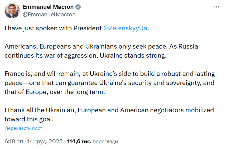 Раніше Еммануель Макрон заявив: «Я щойно розмовляв з президентом Володимир Зеленський. Американці, європейці та українці прагнуть лише миру. Поки Росія продовжує свою агресивну війну, Україна залишається сильною. Франція є і залишатиметься на боці України, щоб побудувати міцний і тривалий мир, який зможе гарантувати безпеку та суверенітет України і Європи в довгостроковій перспективі. Я дякую всім українським, європейським та американським переговірникам, які мобілізувалися для досягнення цієї мети».