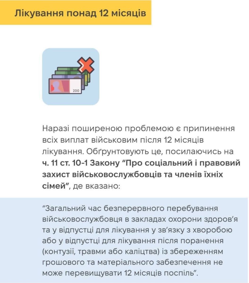 «Загальний час безперервного перебування військовослужбовця в закладах охорони здоров’я та у відпустці для лікування у зв’язку з хворобою або у відпустці для лікування після поранення (контузії, травми або каліцтва) із збереженням грошового та матеріального забезпечення не може перевищувати 12 місяців поспіль».