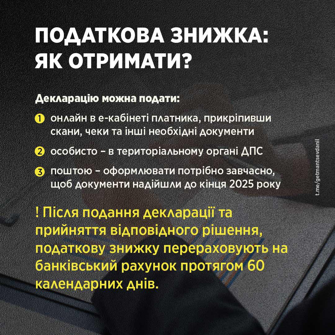 Для отримання податкової знижки за 2024 рік декларацію потрібно подати до 31 грудня 2025 року. Це можна зробити: