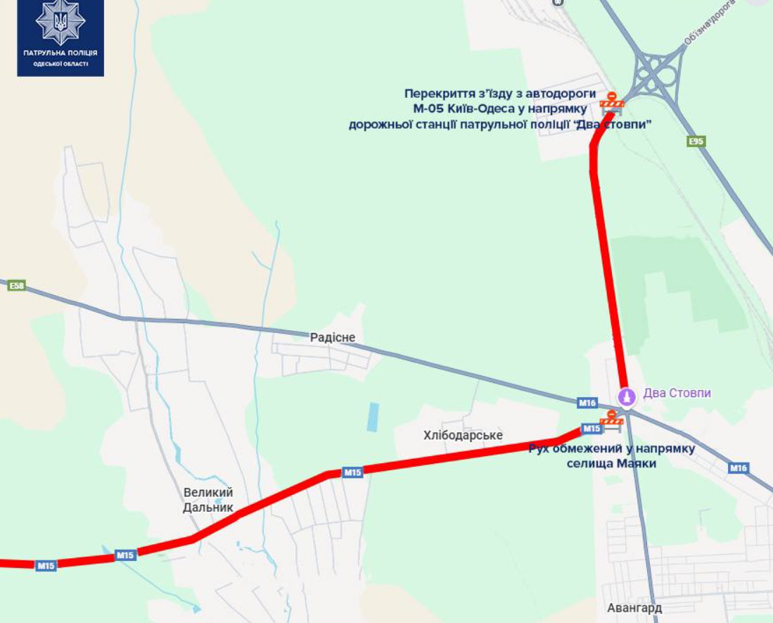 Також перекритий з'їзд з автодороги М-05 Київ-Одеса (транспортна розвʼязка у напрямку дорожньої станції патрульної поліції «Два Стовпи»).