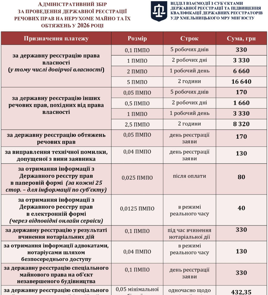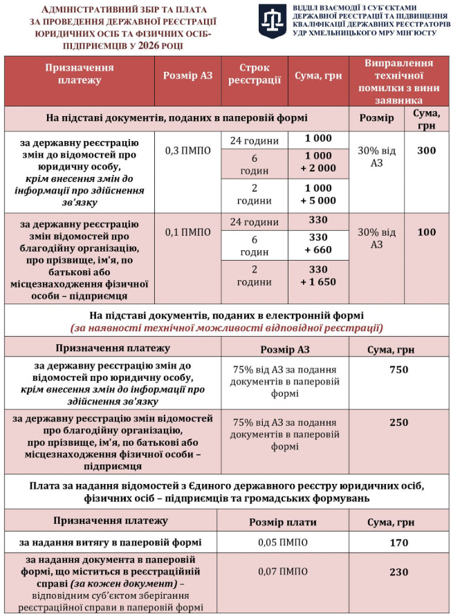 З 1 січня в Україні змінилися розміри адміністративного збору та плати за проведення державної реєстрації прав та бізнесу. Про це нагадало Управління державної реєстрації Хмельницького МРУ Мін'юсту.