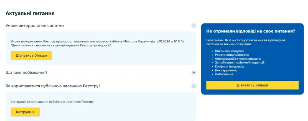 Також НАЗК зауважує, що у блоці «Актуальні питання» Реєстру користувачі можуть самостійно знаходити відповіді на найпоширеніші питання стосовно окремих аспектів використання Реєстру та застосування законодавства у сфері лобіювання, без необхідності звертатися до служби підтримки НАЗК.