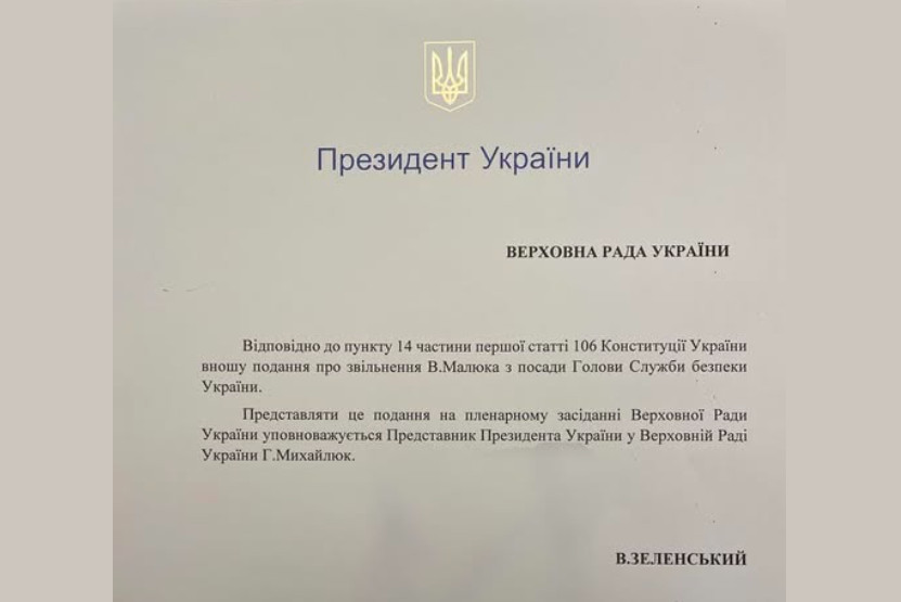 До Верховної Ради надійшло подання Президента України Володимира Зеленського про звільнення Василя Малюка з посади голови Служби безпеки України. Про це повідомив спікер парламенту Руслан Стефанчук.