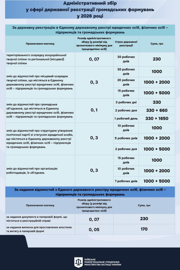 З огляду на це, з 1 січня 2026 року встановлено такі розміри адміністративного збору у сфері державної реєстрації громадських формувань