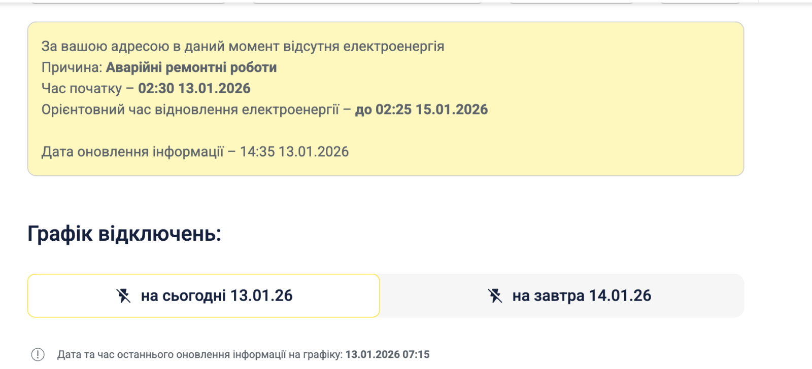 Згідно з повідомленнями, які отримали місцеві мешканці, відновлення електропостачання очікується після 02:25 15 січня. У ДТЕК зазначають, що терміни можуть змінюватися залежно від перебігу ремонтних робіт та безпекової ситуації.