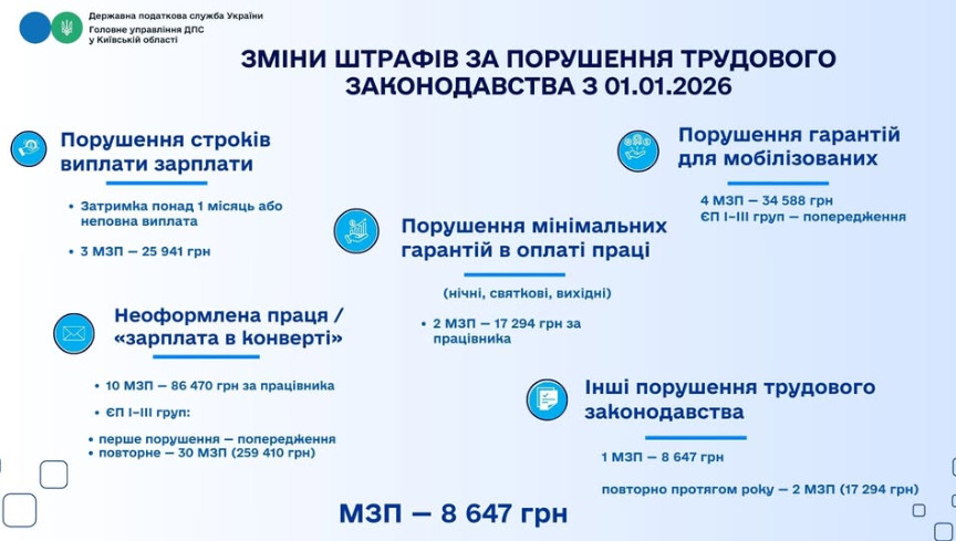З 1 січня 2026 року в Україні змінилися розміри фінансових санкцій за порушення законодавства про працю. Такі зміни пов’язані з набранням чинності Закону України про Державний бюджет на 2026 рік, яким установлено новий розмір мінімальної заробітної плати на рівні 8 647 гривень. Про це нагадало Головне управління Державної податкової служби у Київській області.