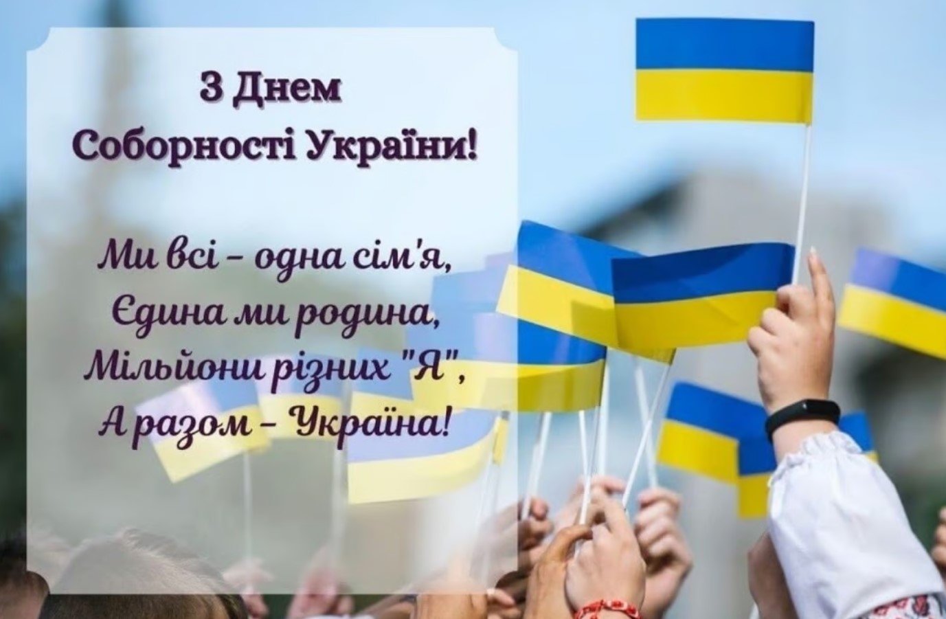 Вітаємо з Днем Соборності України — днем, який утвердив прагнення українців до єдиної держави. Події минулого й сьогодення доводять, що єдність залишається нашою найбільшою силою. Бажаємо взаємної підтримки, стійкості та миру для кожної родини. Нехай Україна буде цілісною і сильною.