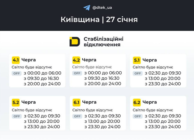 Як вимикатимуть світло на Київщині 27 січня — ДТЕК оприлюднив графіки