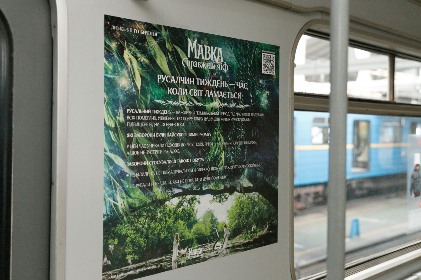 Усередині вагона розміщені постери, присвячені мавкам, русалкам та іншим персонажам українських легенд. Артпоїзд курсуватиме синьою лінією київського метро протягом двох місяців.