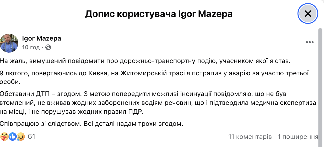 Про ДТП Мазепа повідомив вранці 10 лютого. За його словами, аварія сталася під час повернення до Києва Житомирською трасою. Бізнесмен зазначив, що наразі співпрацює зі слідством і готовий надати всі необхідні пояснення після встановлення обставин події.