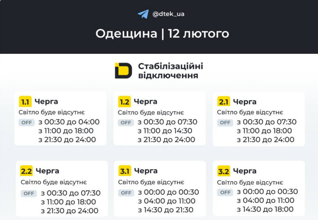 Як вимикатимуть світло на Одещині 12 лютого — графіки від ДТЕК