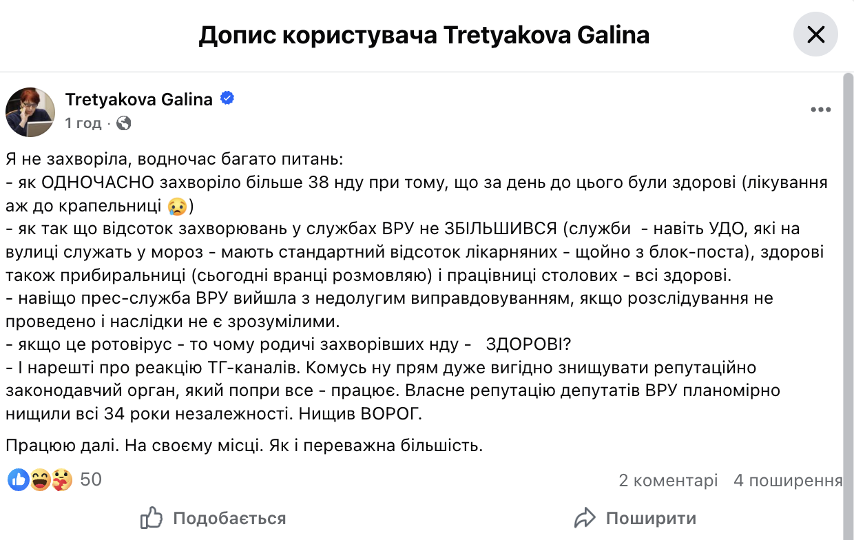 Народна депутатка Галина Третьякова прокоментувала ситуацію з масовими повідомленнями про погіршення самопочуття серед парламентарів та заявила, що одночасно захворіло більше 38 депутатів. Вона також зазначила, що частині з них знадобилося лікування, зокрема із застосуванням крапельниць.