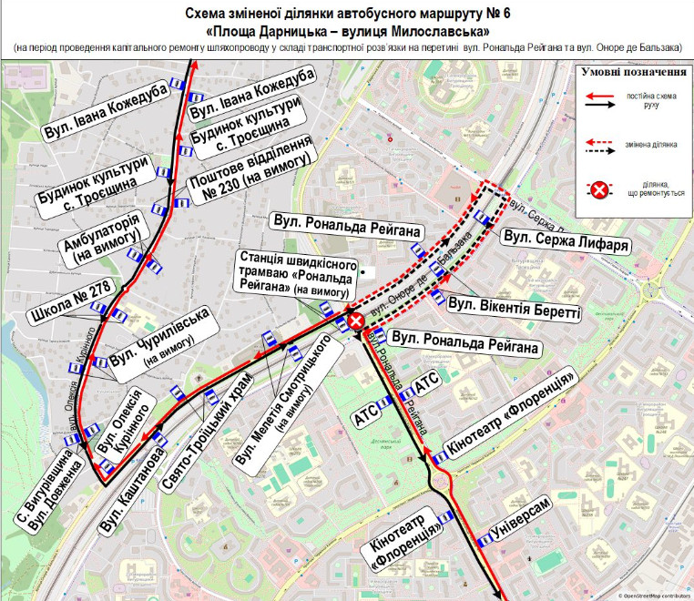 - автобусний маршрут № 6 «Дарницька площа – вул. Милославська» – від Дарницької площі до вул. Рональда Рейгана за власним маршрутом, далі вул. Оноре де Бальзака (парна сторона) – шляхопровід через колії швидкісного трамвая на вул. Сержа Лифаря – вул. Оноре де Бальзака (непарна сторона) – вул. Олексія Курінного, далі за власним маршрутом до вул. Милославської. У зворотному напрямку – від вул. Милославської до вул. Олексія Курінного за власним маршрутом, далі вул. Оноре де Бальзака (непарна сторона) – шляхопровід через колії швидкісного трамвая на вул. Сержа Лифаря – вул. Оноре де Бальзака (парна сторона) – вул. Рональда Рейгана, далі за власним маршрутом до Дарницької площі;