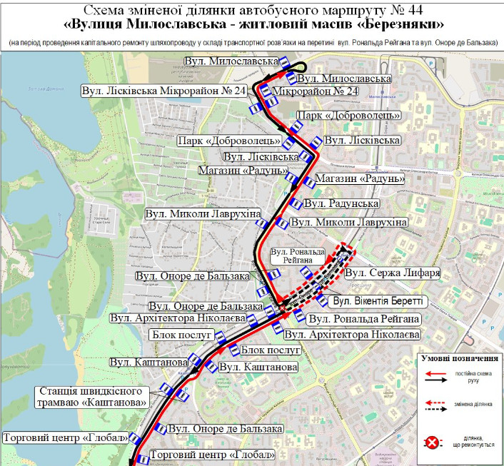 - автобусний маршрут № 44 «Житловий масив «Березняки» – вул. Милославська» – від станції міської електрички «Березняки» до вул. Оноре де Бальзака (парна сторона) за власним маршрутом, далі шляхопроводом через колії швидкісного трамвая на вул. Сержа Лифаря – вул. Оноре де Бальзака (непарна сторона) – вул. Рональда Рейгана, далі за власним маршрутом до вул. Милославської. У зворотному напрямку – від вул. Милославської до вул. Рональда Рейгана за власним маршрутом, далі вул. Оноре де Бальзака (непарна сторона) – шляхопроводом через колії швидкісного трамвая на вул. Сержа Лифаря – вул. Оноре де Бальзака (парна сторона), далі за власним маршрутом до станції міської електрички «Березняки».