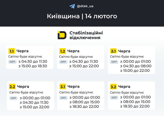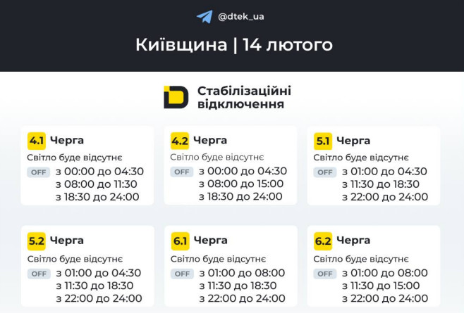 Як вимикатимуть світло на Київщині 14 лютого — ДТЕК оприлюднив графіки