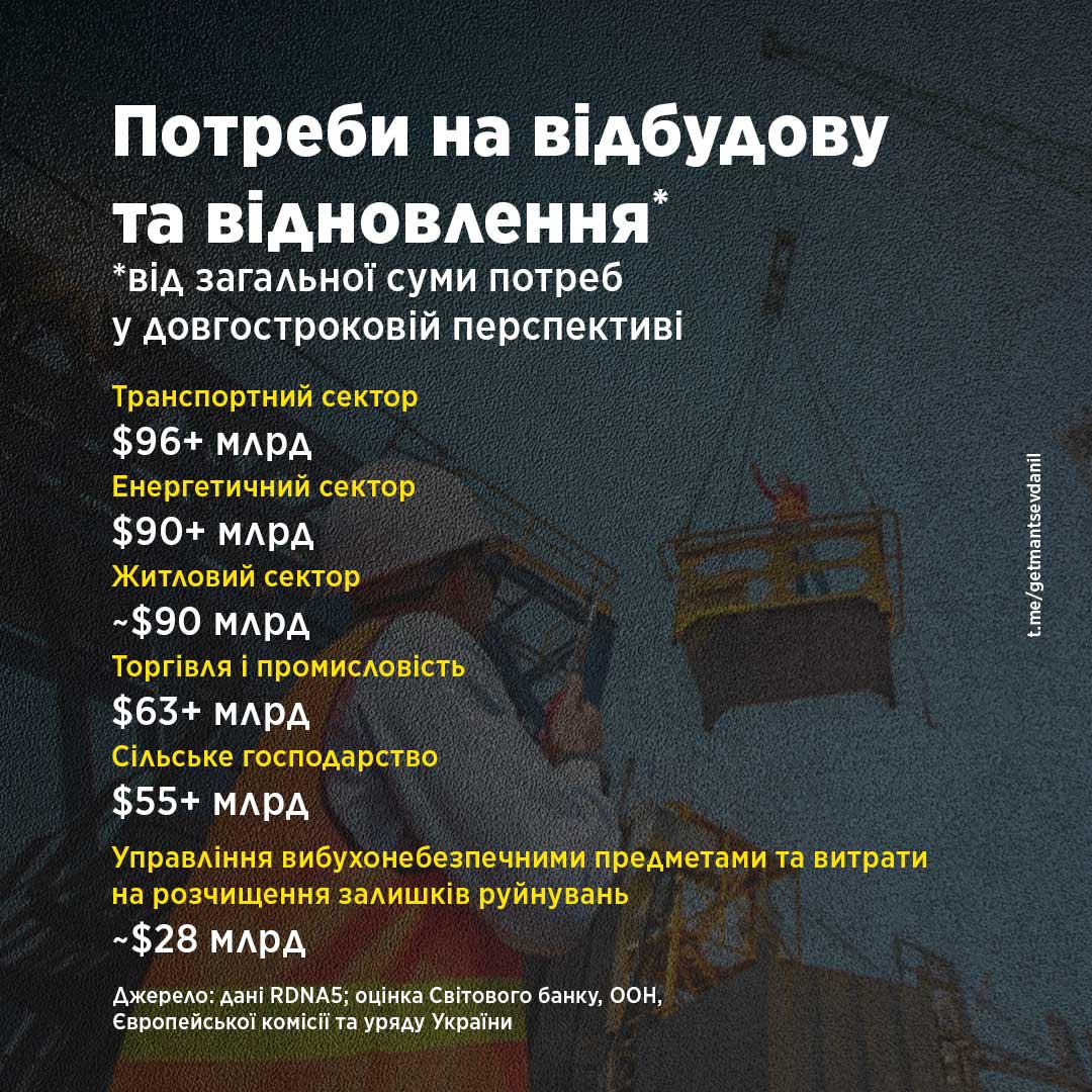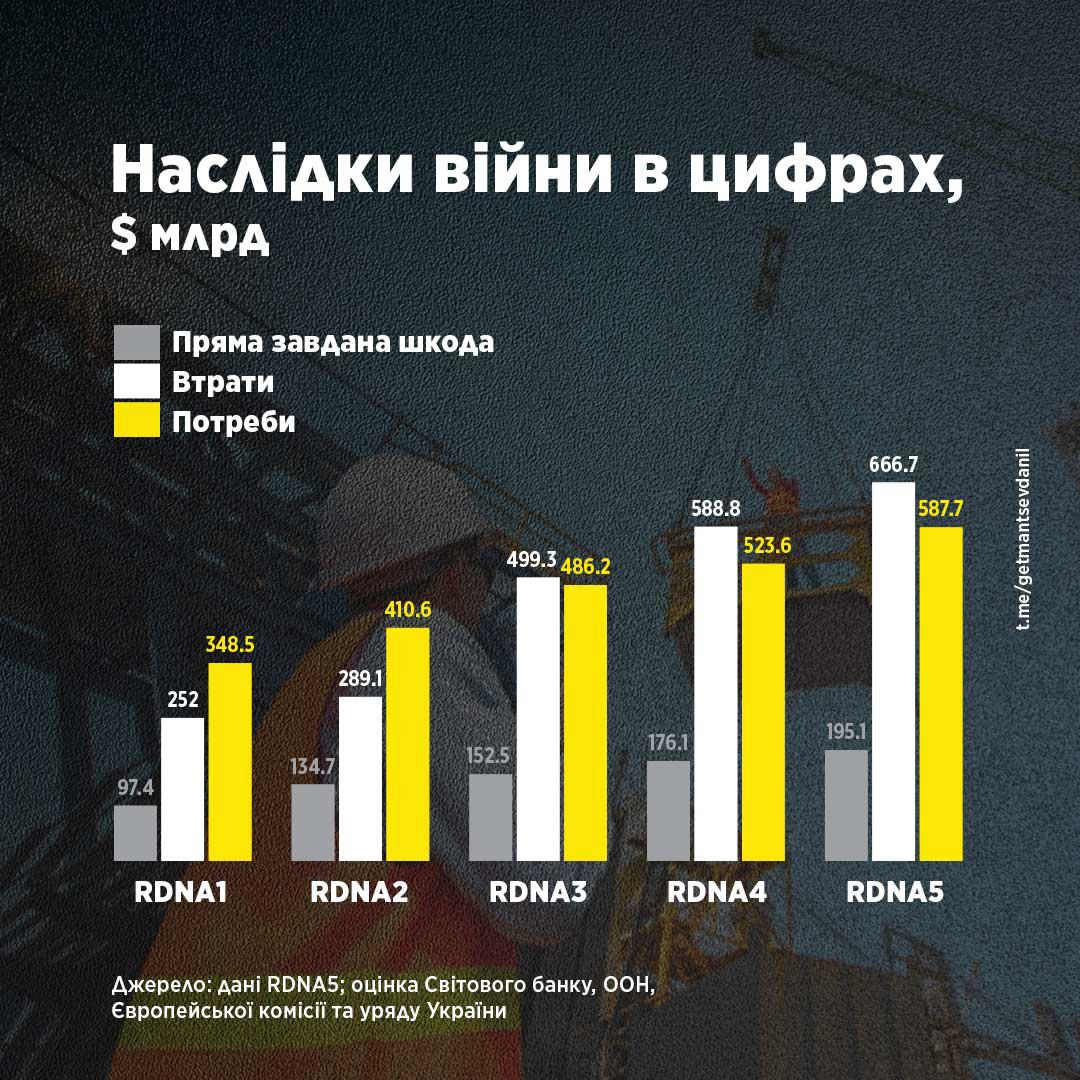Гетманцев також повідомив, що прямі збитки від війни наразі оцінюються у 195,1 млрд доларів (+10,8%), економічні та соціальні втрати — у 666,7 млрд доларів (+13,2%), а потреби у відновленні впродовж наступного десятиліття — у 588 млрд доларів (+12%). Найбільші інвестиції, за його словами, знадобляться для відновлення транспорту (понад 96 млрд дол.), енергетики (91 млрд дол.) та житлового фонду (90 млрд дол.).