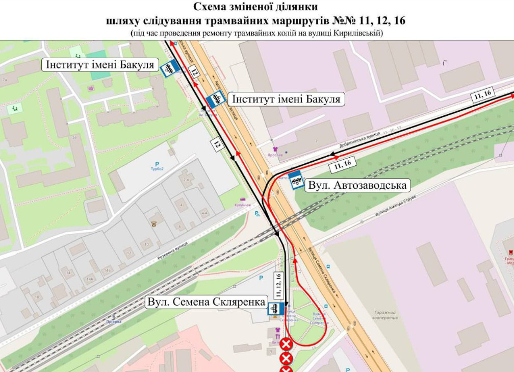 - маршрути №№11,12,16 відповідно від вул. Йорданської, Пущі-Водиці та ст. м. «Героїв Дніпра» до вул. Семена Скляренка;
