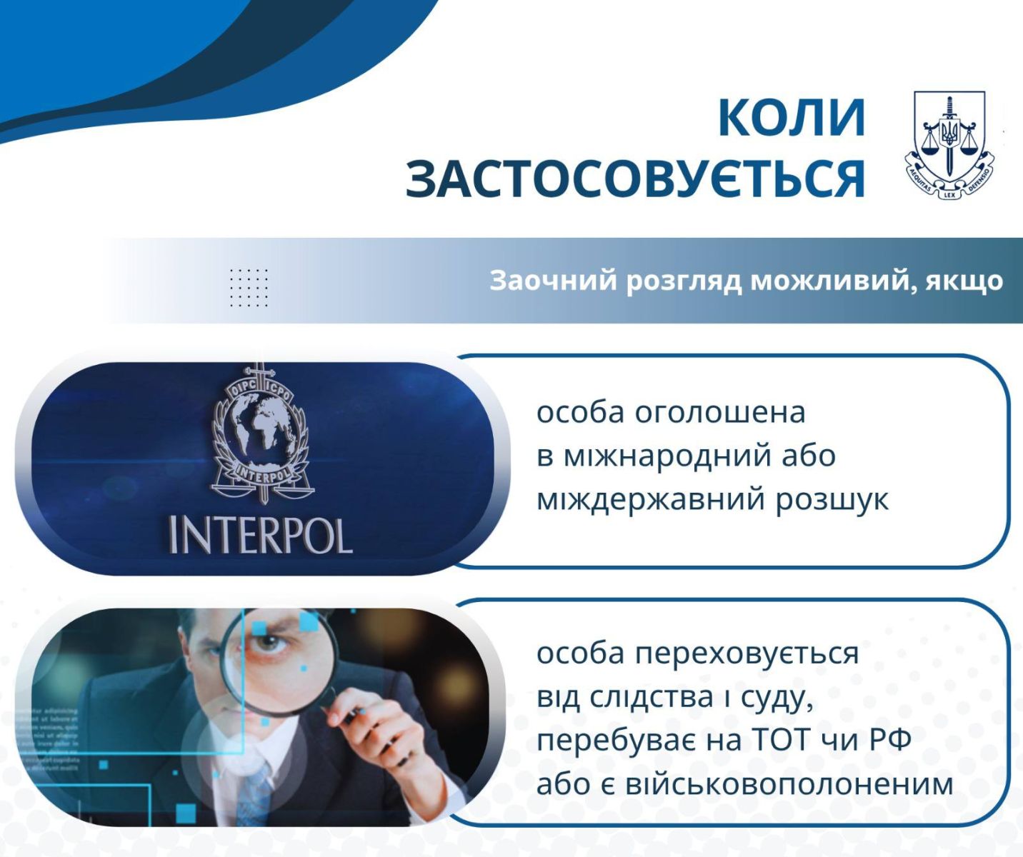 Заочний розгляд застосовується у випадках, коли особа оголошена в міжнародний або міждержавний розшук, переховується від слідства та суду, перебуває на тимчасово окупованих територіях чи в РФ, або є військовополоненим.