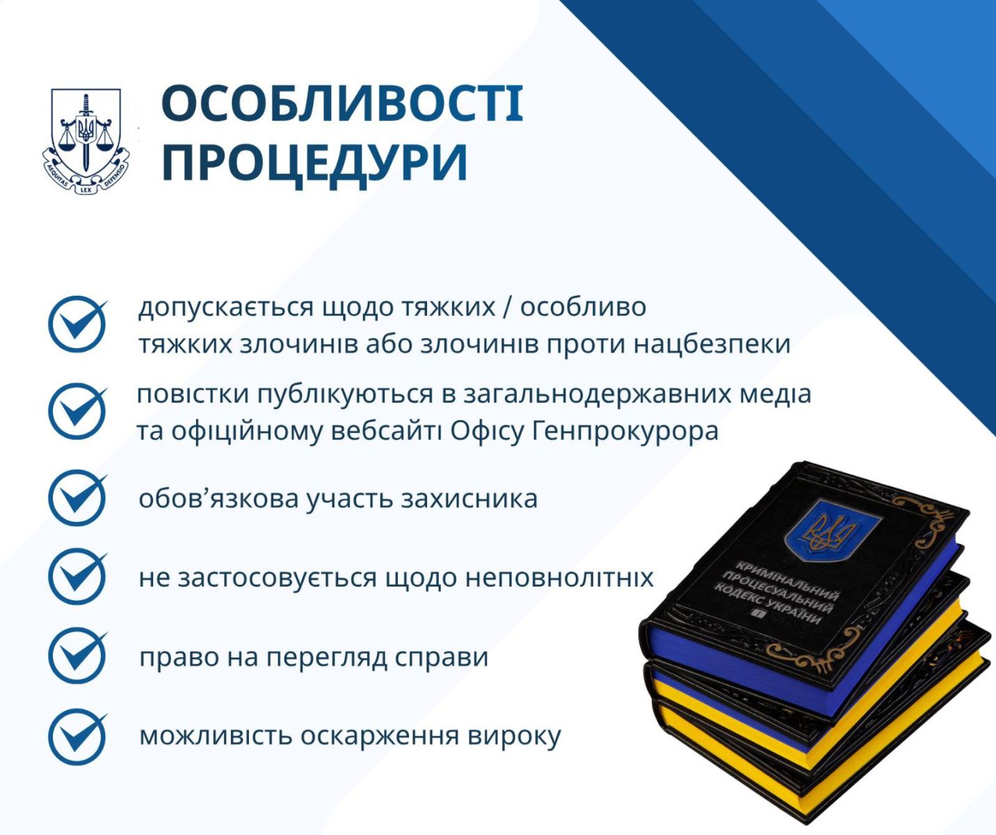 Процедура допускається щодо тяжких та особливо тяжких злочинів або злочинів проти нацбезпеки. Повістки публікуються у загальнодержавних медіа та на офіційному сайті Офісу Генпрокурора. Участь захисника є обов’язковою, але не застосовується до неповнолітніх. Обвинувачений має право на перегляд справи та оскарження вироку.